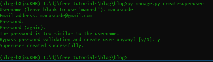 Now Django will ask you some required fields like username email and password after doing that you should see something look like this.